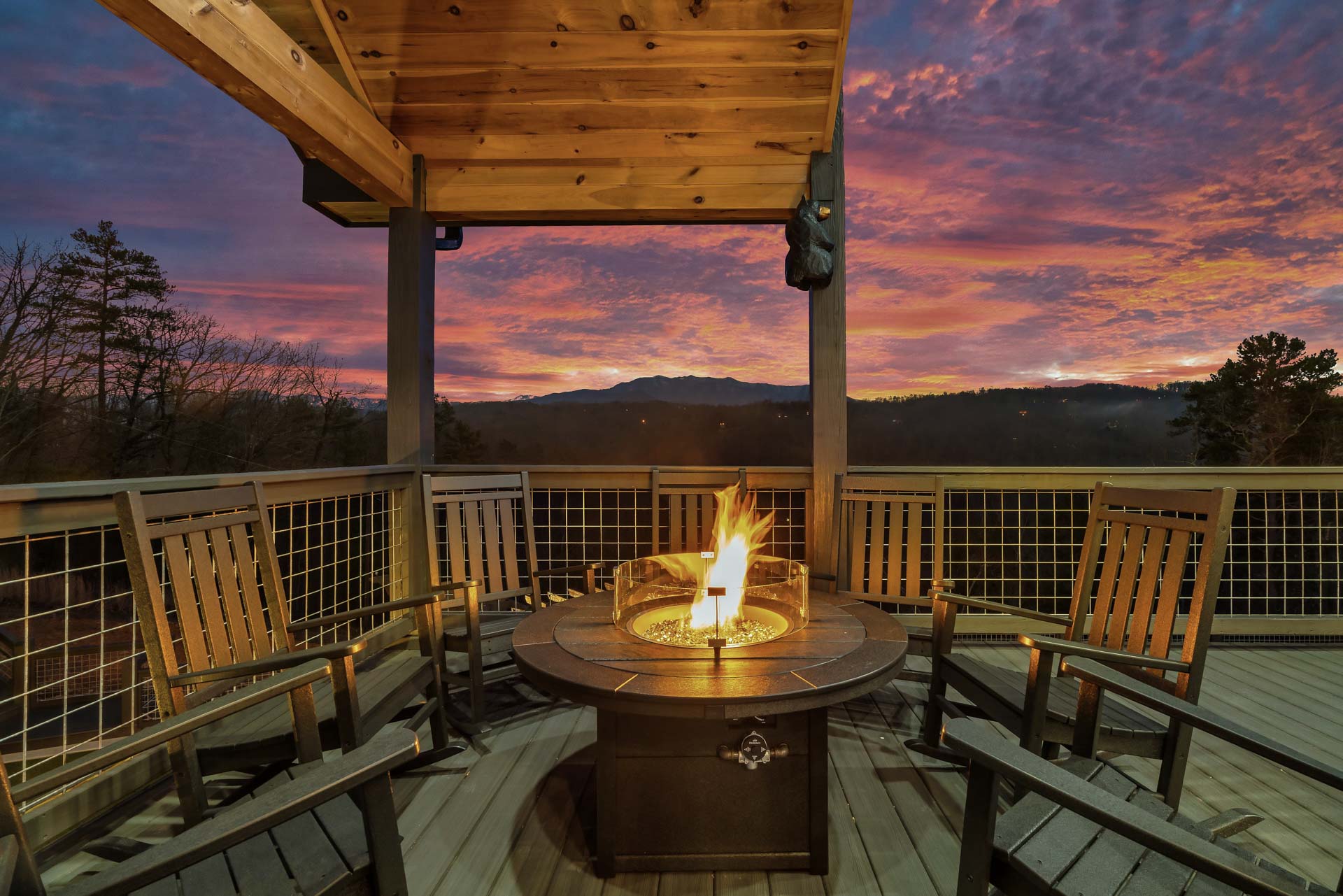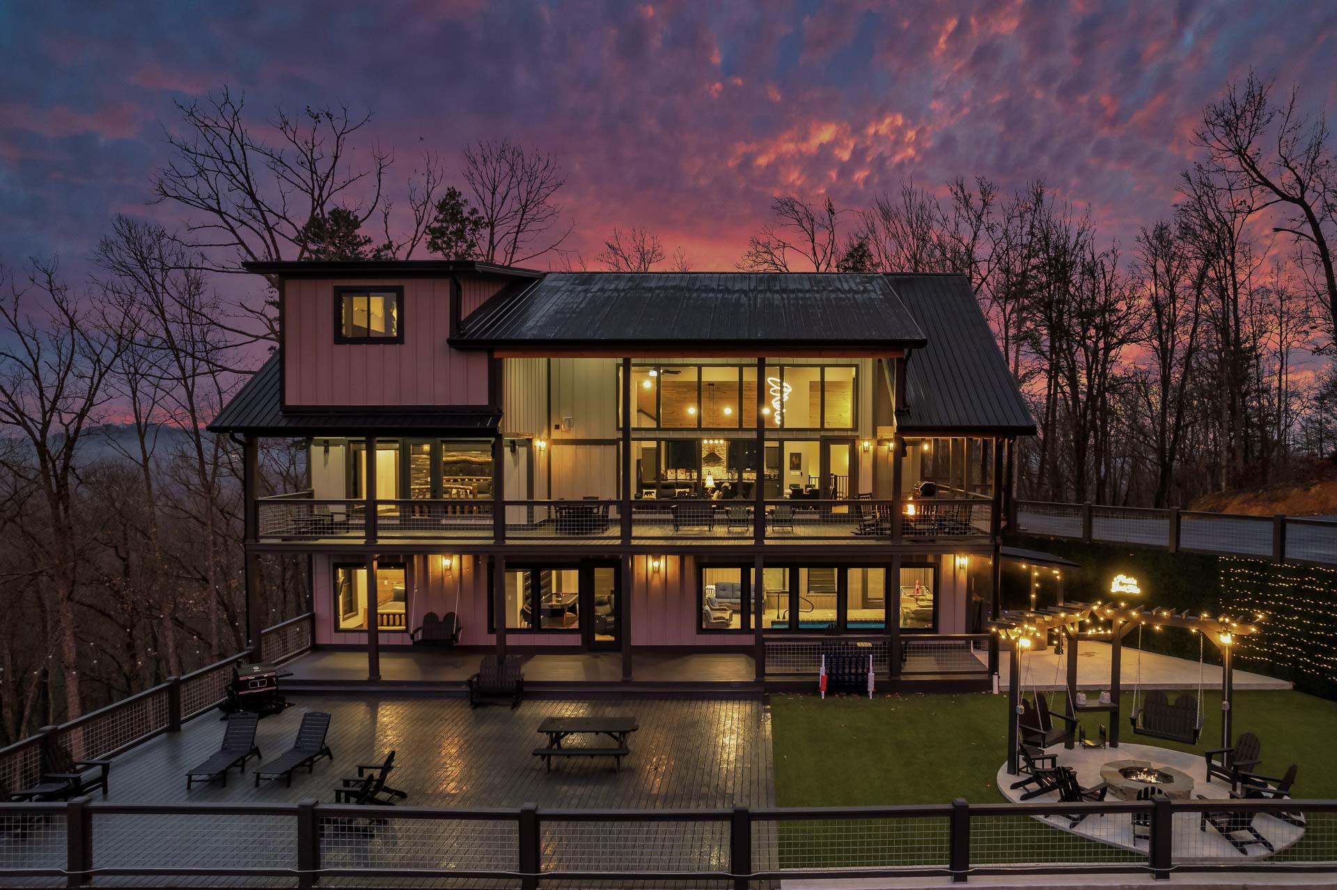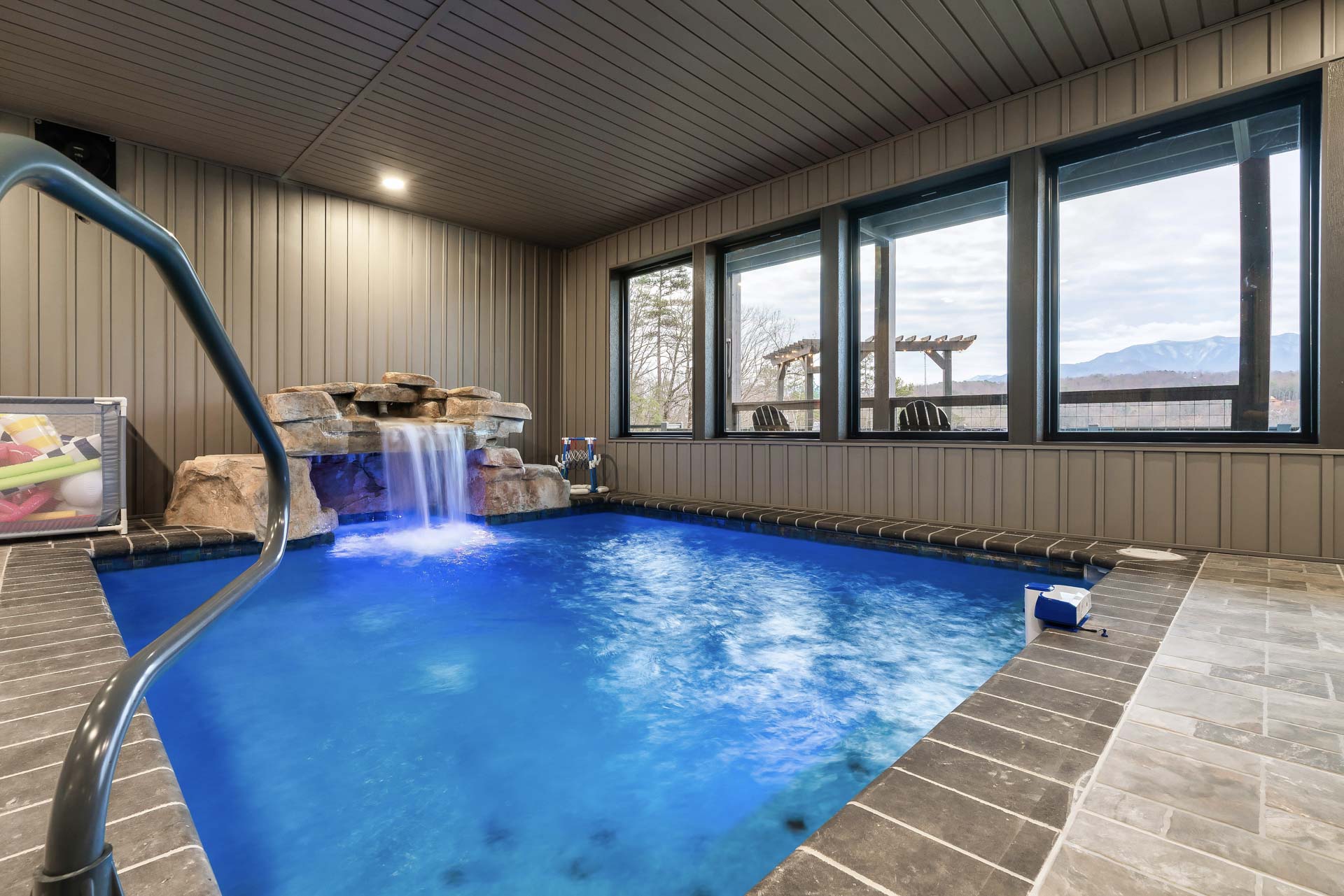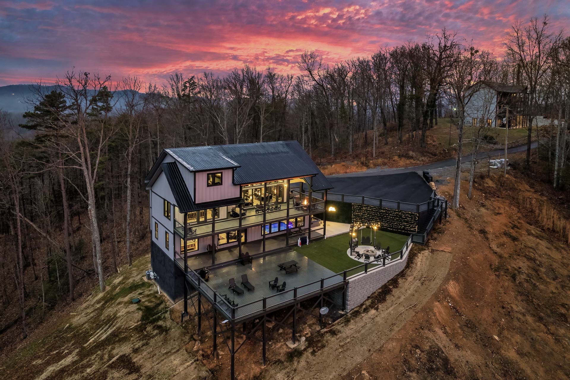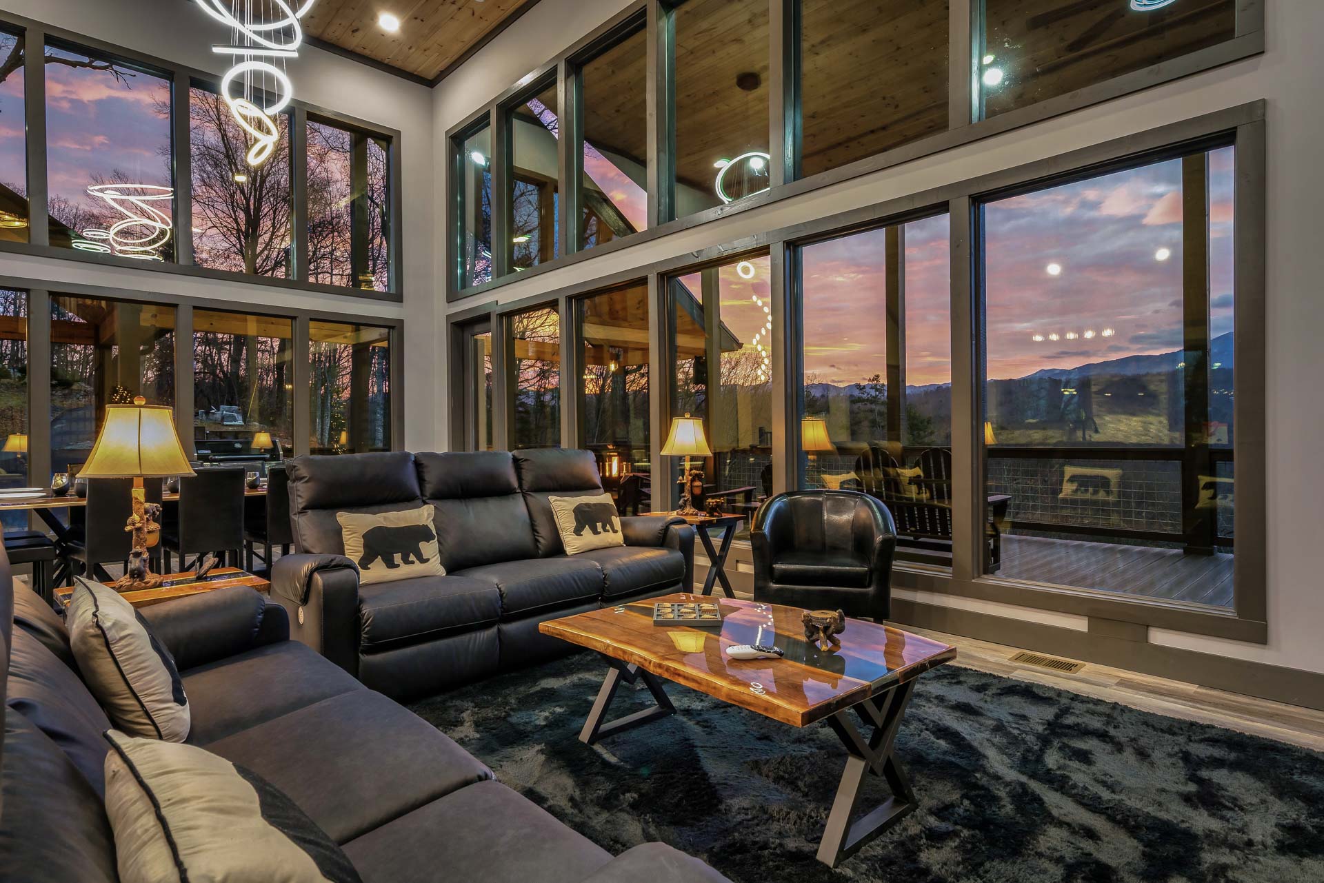 This home captures some of the most breathtaking views of Mount LeConte, enjoyed from expansive decks and thoughtfully designed outdoor living areas with artificial turf. Designed for both luxury and entertainment, the 6-bedroom, 6.5-bath residence features a dedicated game room, private theater, and an indoor pool, creating a true destination retreat.